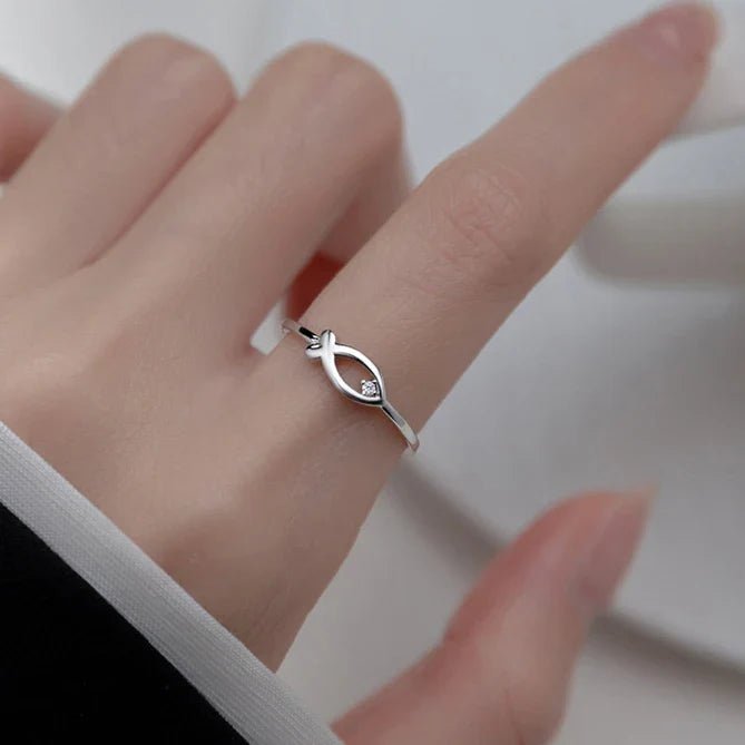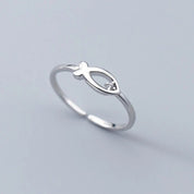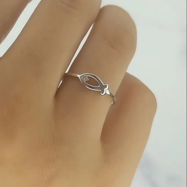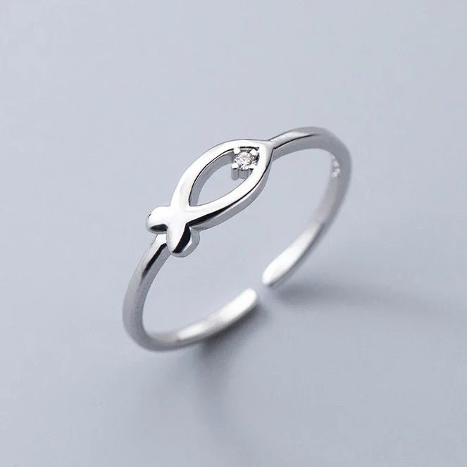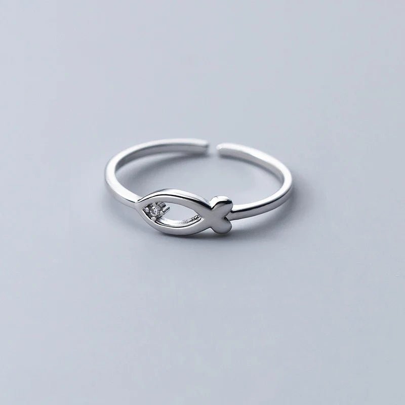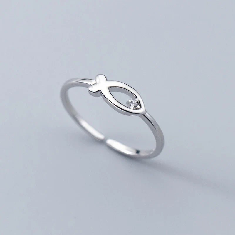 Anel Cristão Ajustável em Prata 925 - Peixe de Jesus com Pedrinha Brilhante