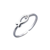 1x Anel Cristão Ajustável em Prata 925 - Peixe de Jesus com Pedrinha Brilhante